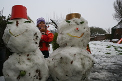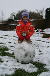 Jack helped make some snowmen. They had hats, eyes, noses and arms. Jack sat on the top.
